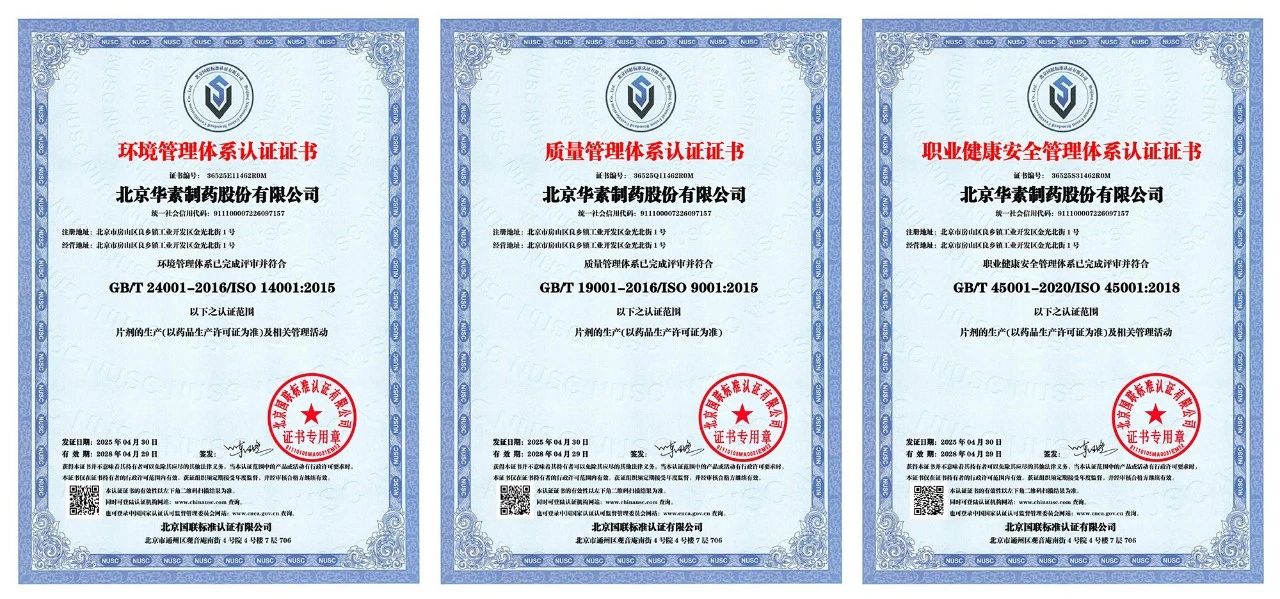 近日,97欧美在线看欧美视频免费-色欲AV蜜臀AV久久浪潮AV-国产盗摄精品一区二区三区-国产乱人伦真实精品视频-免费播放男人添女人下边APP旗下北京华素制药股份有限公司(简称“北京华素制药”)顺利通过ISO9001质量管理体系、ISO14001环境管理体系及ISO45001职业健康安全管理体系认证。此次认证通过,标志着北京华素制药在药品质量管控、绿色发展实践及员工职业健康安全管理方面迈上新台阶,为企业在持续深化的医药改革背景下实现良性经营筑牢安全防线。